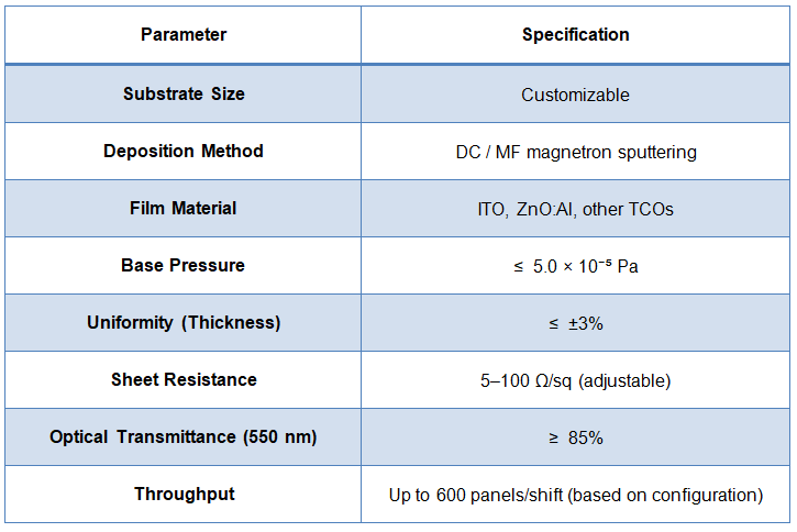 Closed-loop control ensures repeatable process conditions, maintaining consistent film sheet resistance (as low as 5–15 Ω/sq) and high optical transmittance (≥ 85%).